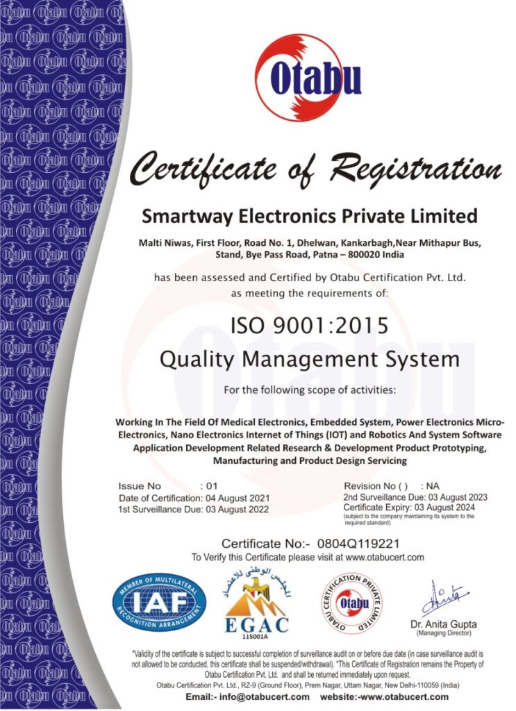 We are startup company @ Incubation Center, IIT Patna working in the field of Medical Electronics, Embedded system, Micro-electronics, Nano electronics, Internet of Things(IOT) and Robotics and system software related Research & Development, product prototyping and Design servicing. It has been established with an aim to develop center of advanced electronics research & development At SMARTWAY ELECTRONICS, we take pride in design innovation and accept engineering challenges for developing quality products.